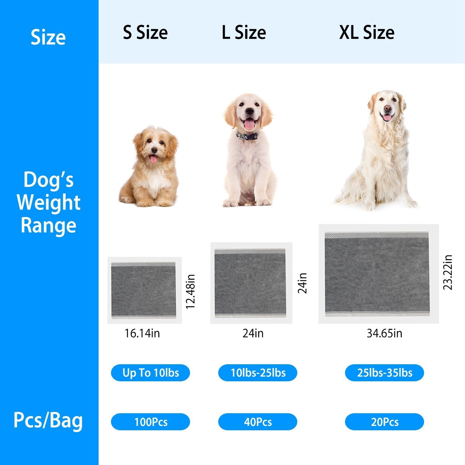 **Wide Compatibility*:Come with S/L/XL Size options; our training pads work perfectly for dogs of all ages; for puppies; adult dogs; elderly canines; incontinence dogs; kittens; cats or other pets.