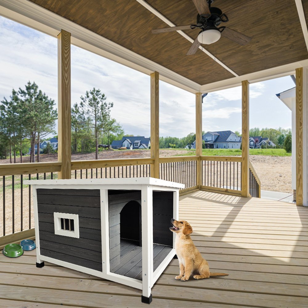 4.ALL-WEATHER CONSTRUCTION: The roof of this doghouse is waterproof asphalt designed to protect your pet from inclement weather and can be comfortable. The roof can withstand most weather conditions, like rain, snow, sun, wind and more.