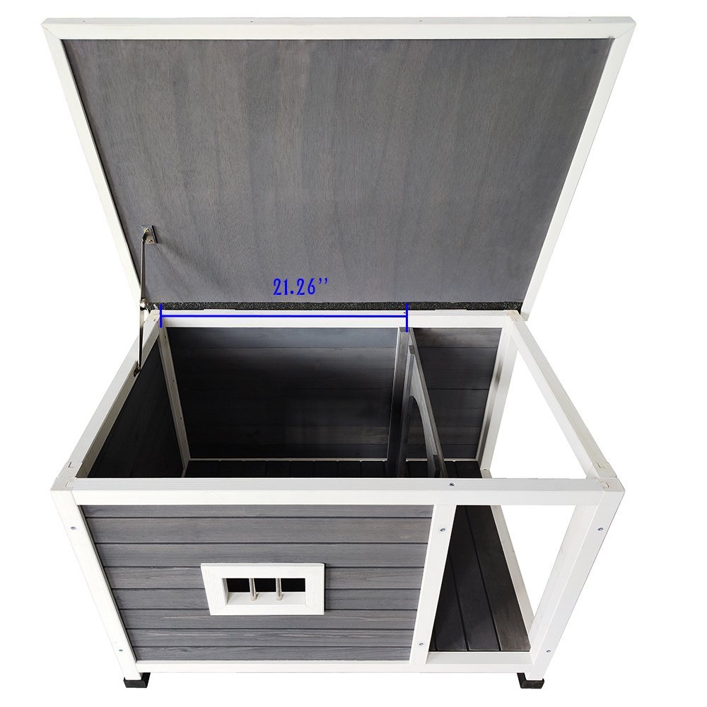 1.STYLE: It can match the color and architectural style of your house. It uses environmentally friendly water-based paint and has no odor. Designed with porch and 1 separate living rooms,It has a window with a guardrail,The roof can be opened for easy cleaning and ventilation.Suitable for medium size dogs weighing up to 30 lbs